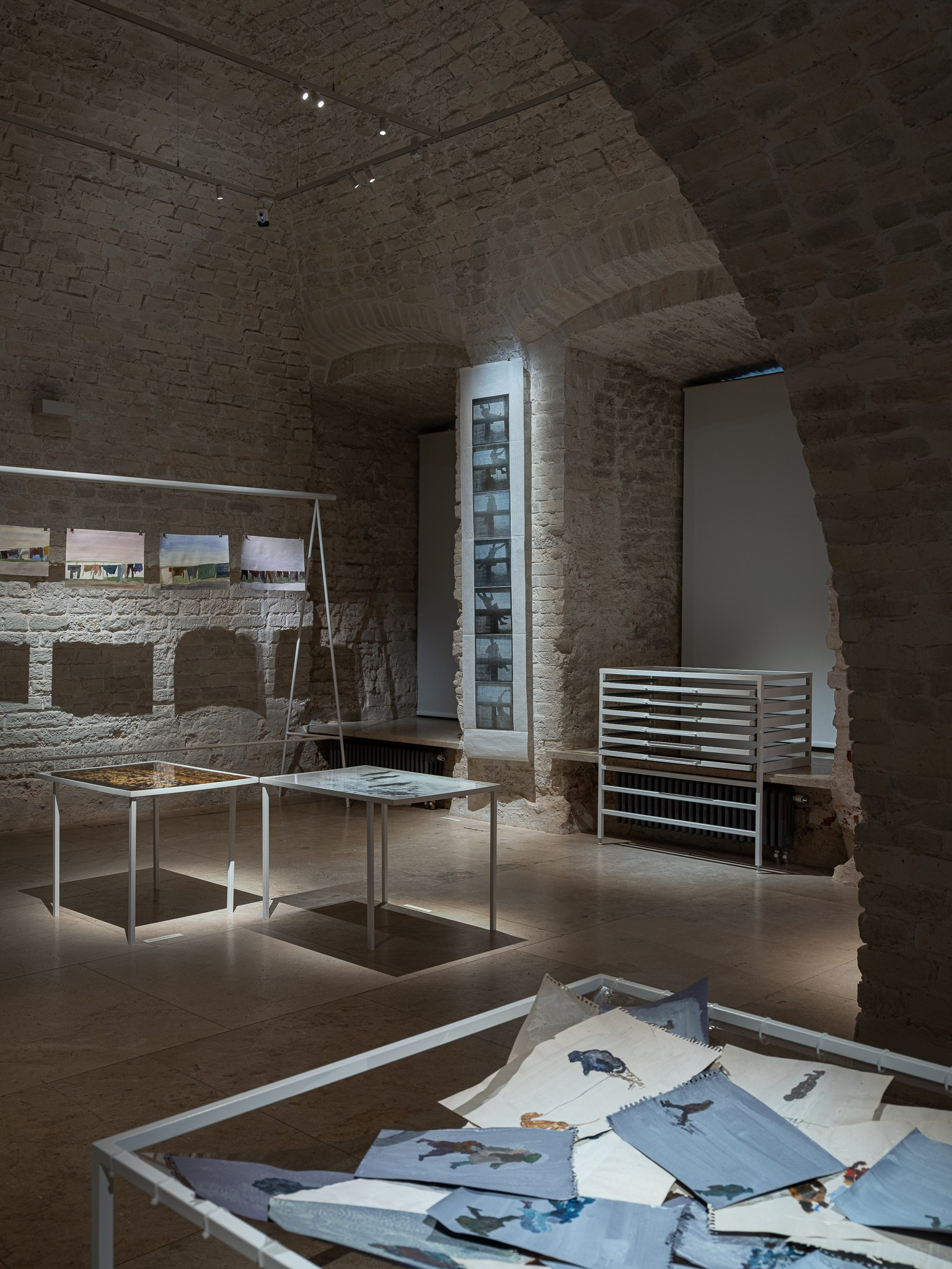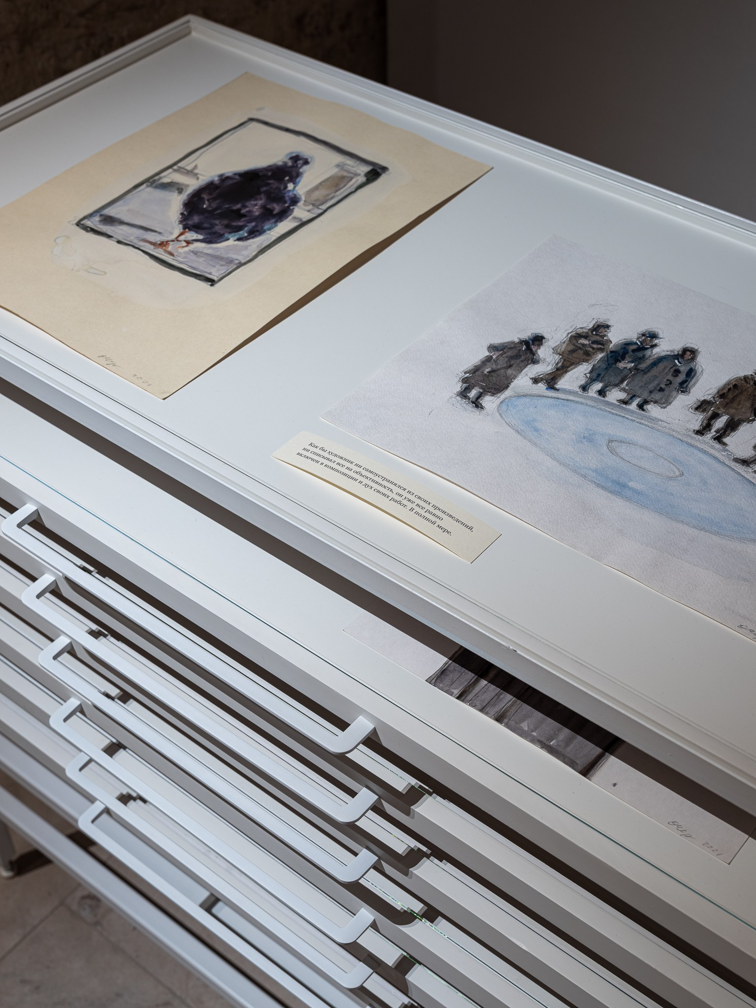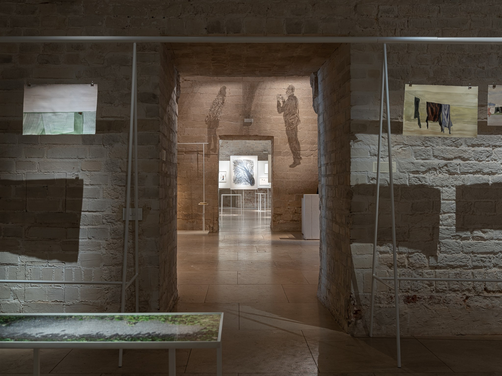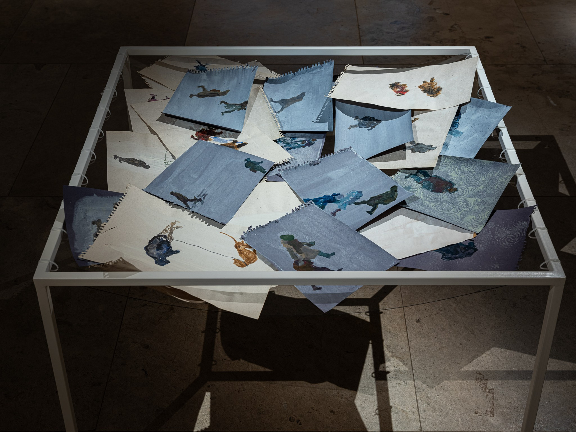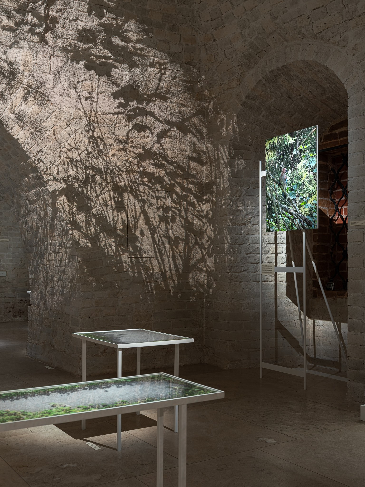 Два других зала выставки, посвященные образу листа как растительного элемента, предполагают особый, «неантропоцентричный», ракурс, где люди уступают место природе. В залах будут представлены разные состояния природы в акварелях из серии «Стирки» (2024)и «Пособие для роботов по изучению людей» (2019), живописных работах «Звук в лесу» (2024) и «Москва-река» (2025), видео-инсталляции «Blue ovals» (2018), а также в графических работах разных лет и фотографиях.